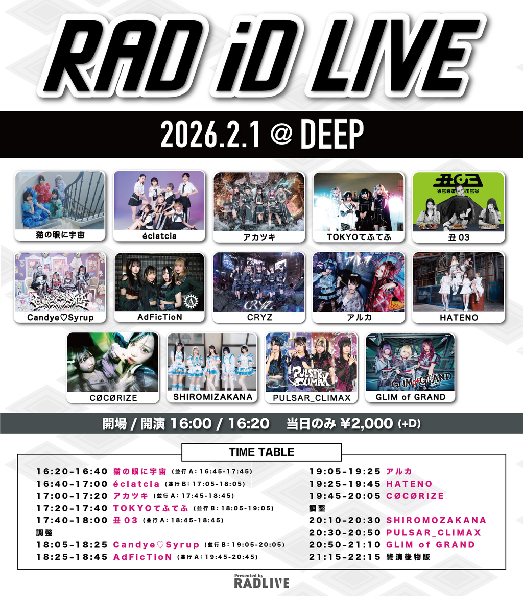 2026.02.01 2/1(日)【夜帯】RAD iD LIVE シェア ツイート LINE 02.01(日) RAD iD LIVE at DEEP 開場:16:00 /開演:16:20 チケット 当日券のみ ¥2,000(+D)